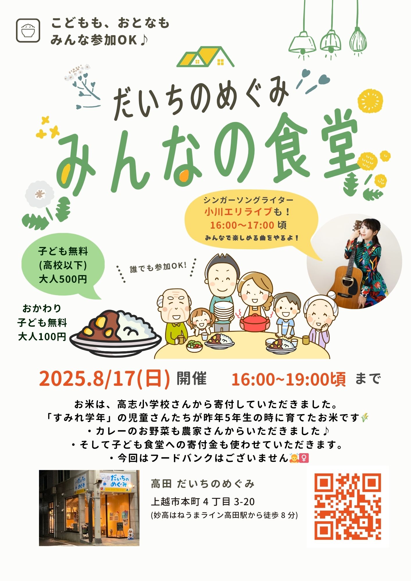 8/17(日)にだいちのめぐみさんのみんなの食堂イベントにお邪魔いたします♪